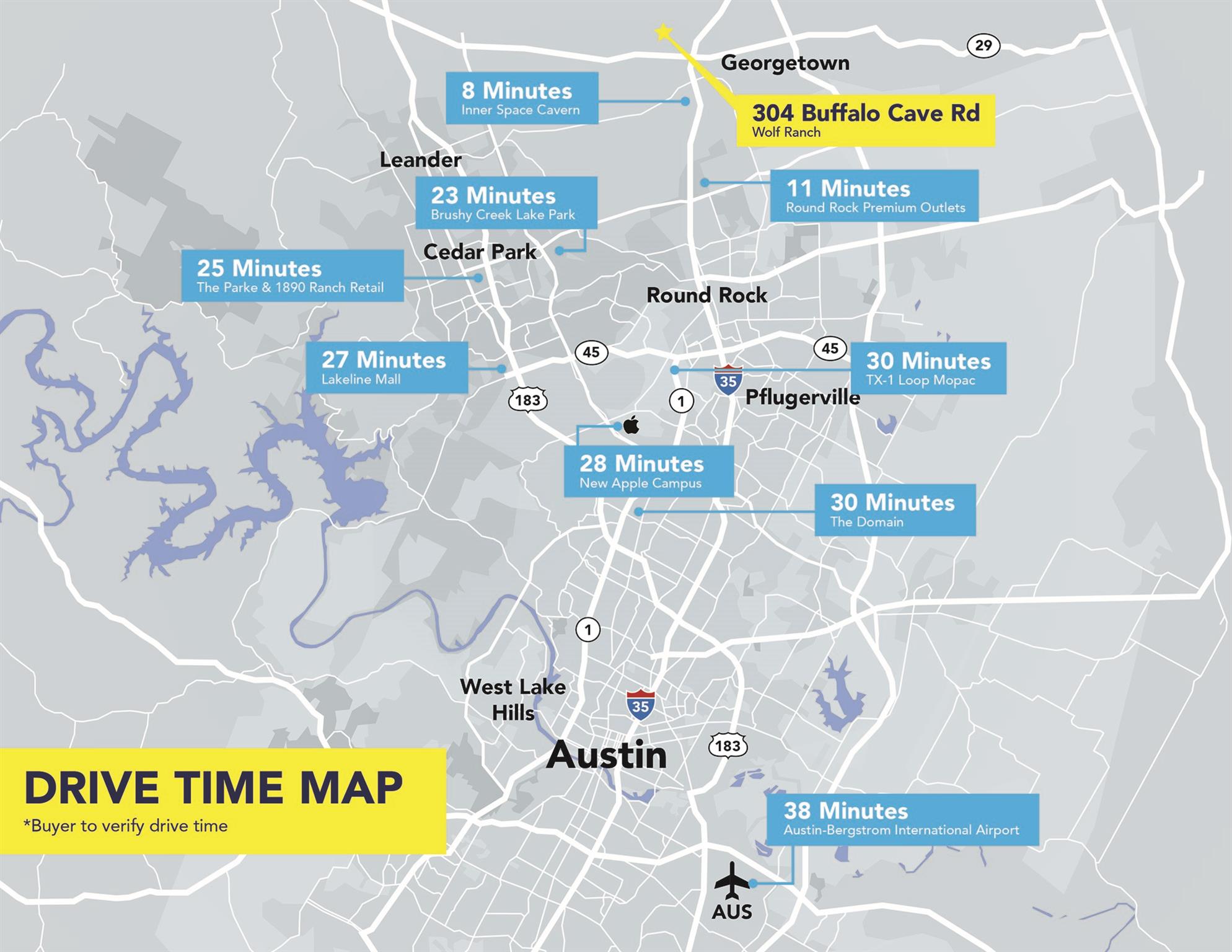 From north on I35, left on 29, right on Wolf Ranch Pkwy, left on Scout St, right on Mercer Rd, then left on Buffalo Cave Rd. Home will be on the left.