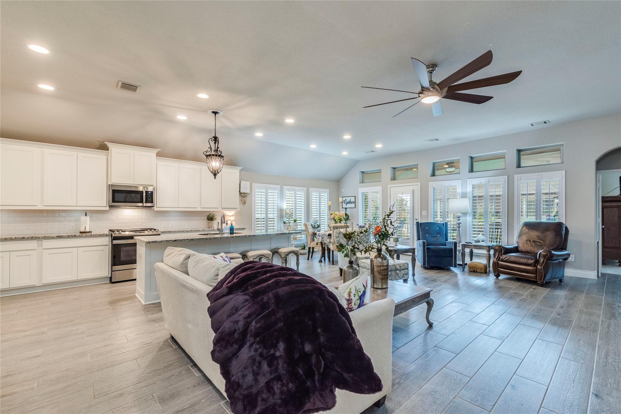 Just starting out, starting over or downsizing? Dont wait to build! 4209 Mercer Road is move-in ready with plenty of custom upgrades and an incredible floor plan featuring 4 bedrooms PLUS a dedicated home office and 3 full baths. Inside youll be greeted by soaring 12 foot ceilings and an open floor plan that connects the living room, kitchen, and dining areas. The kitchen features a gas range with a center island, farmhouse sink and plenty of cabinet and counter space. Large windows flood the space with natural light and custom plantation shutters that have been added throughout the home. The lighting and ceiling fans have been upgraded as well. The owners suite has lovely views of the backyard, with the attached bath showcasing a walk-in shower, dual vanities, and a large walk-in closet. One of the best things about this floor plan is that there are no shared walls between any of the 4 bedrooms. The second bedroom with its own attached bath is perfect for multi-generation living. The 3rd and 4th bedrooms conveniently adjoin a double vanity bathroom. In addition to the 4 bedrooms, there is a dedicated office with glass French doors that could be used as a 5th bedroom, play room or second living space if desired. Another standout feature is the extended back patio. The appliances, including water softener, and outdoor TV can convey. A 3 car tandem garage, mudroom, oversized laundry room with room for a refrigerator or freezer and a walk in pantry round out the long list of features that make this home so livable. Wolf Ranch has two amenity centers: The Hilltop offers residents beautiful poolside views, playground, indoor lounge, and covered outdoor patio overlooking the San Gabriel River. The brand new River Camp center boasts an indoor fitness center, event hall, patio, large leisure pool with lounging, splash pad, and event lawn. HOA dues also cover security monitoring through Home Pro. Close to dining, medical, retail and the brand new HEB. Georgetown ISD.