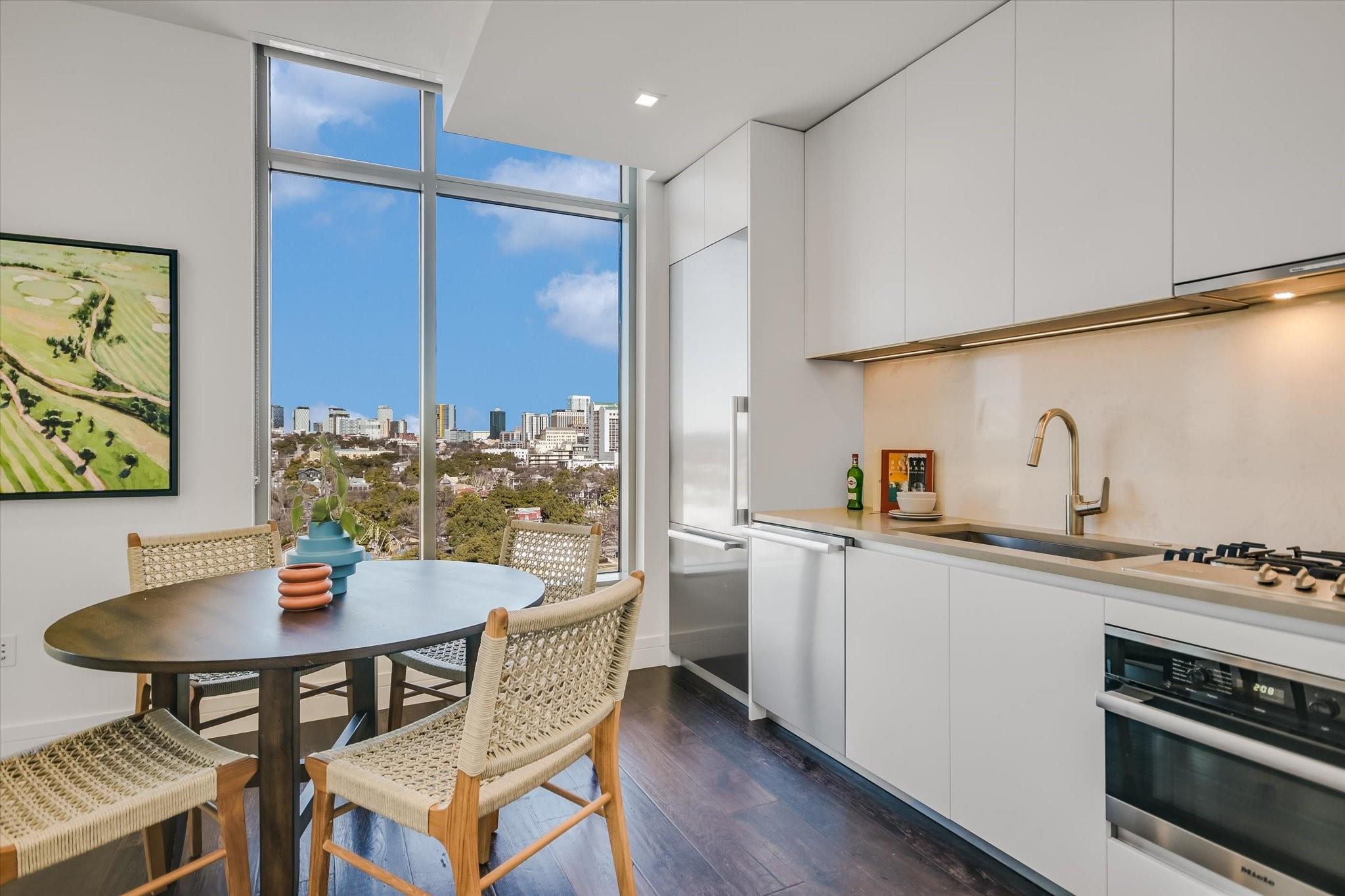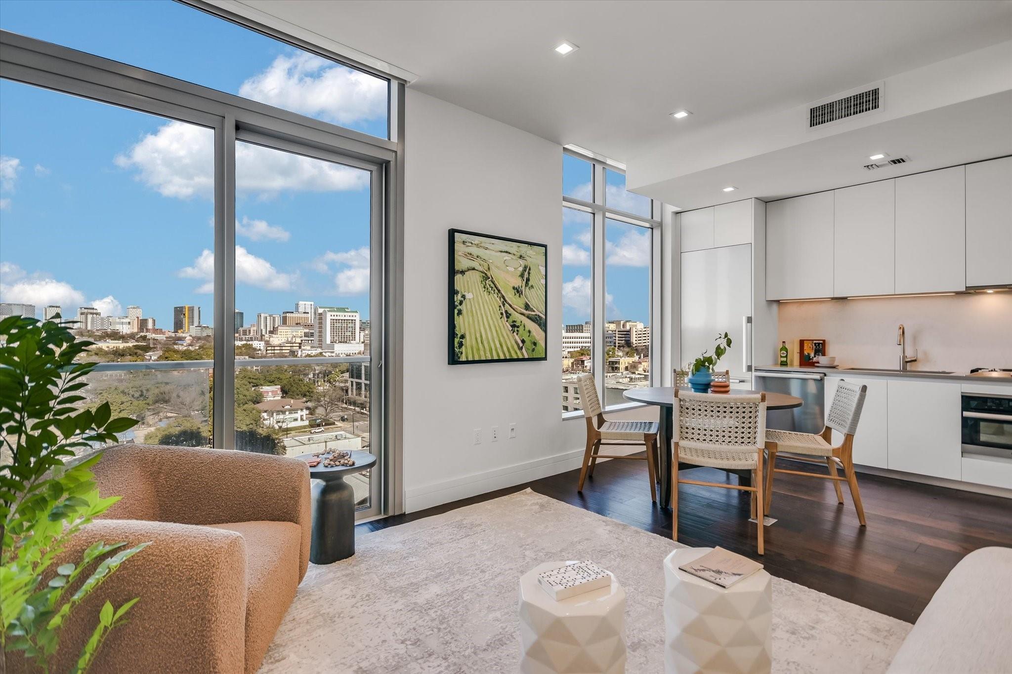 In the middle of the best of downtown, 5th and West offers all the most desirable amenities including a 24-hour concierge, rooftop pool and grill, sun deck, gym and yoga room, indoor dog park and dog wash station, and various interior gathering spaces for meetings and phone calls. This unit has floor-to-ceiling windows, offering views of both the city and the hill country. The kitchen is appointed with top-of-the-line Miele stainless steel appliances, light-colored counter stone, and cabinetry. The floorplan is open in that the kitchen and living share walls. The unit includes a Savant home automation system. One reserved parking space and a highly desirable in-building storage unit convey. Its a short distance to Whole Foods, the new Austin Library, Ladybird Lake, and more. When viewing, make sure to stop at the 5th and 6th floor amenities including the pool and grill deck, the yoga room and gym, the dog grooming station and coffee stop, the commercial kitchen, and various lounge areas. There are also two guest rooms that can be reserved.